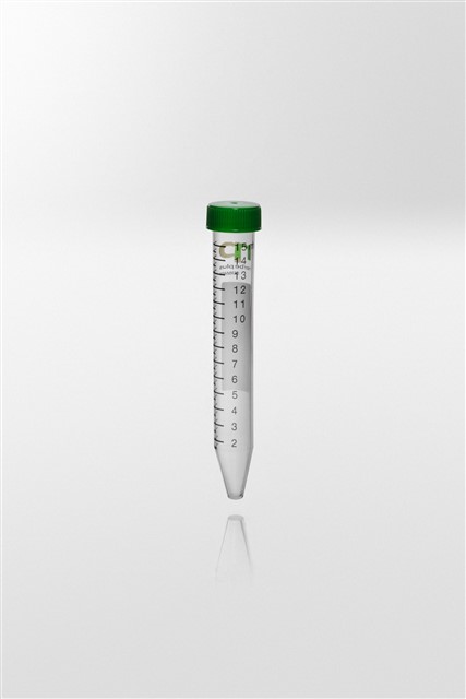 Centrifuge tube PP with screw cap PE, 15ml, Ø17x120mm, con. bottom, tube transp., cap green, sterile, 500pcs/pack